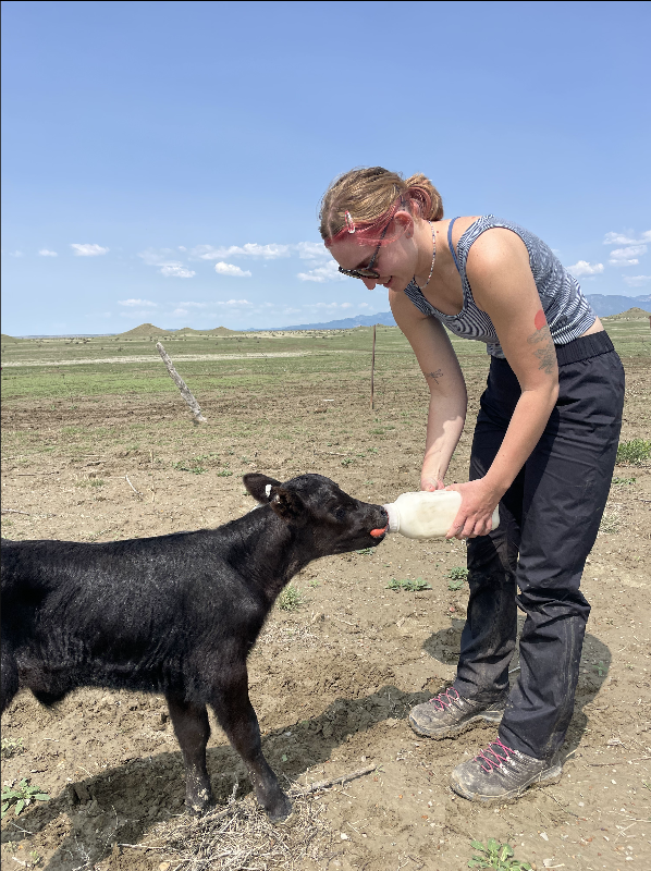 While we were in Pueblo County, Mattie and I also stayed with Maggie Hanna at her ranch for what she referred to as “ranch camp”. Maggie is the Central Grasslands Roadmap Initiative Director at BCR and works with a variety of stakeholders and partners across the central grasslands to help save the prairie. She taught us all about her work and the importance of collaborating with ranchers on conservation efforts to restore and improve their lands. I found the discourse on this subject very interesting. A main theme I gathered is that oftentimes landowners and environmentalists seem to be at odds with each other when in reality if they worked together on these issues they would find that they have a lot more common ground than they initially thought. This is especially true in the case of ranching, since adopting sustainable practices and restoring land is great not only for the cattle but also for the surrounding environment. At the ranch camp, we also learned about Maggie’s irrigation and diversion strategies, met her bulls and learned how her cow-calf operation works, herded some cattle, and planted some willow trees to fortify the banks of her diversion. Maggie was kind enough to let us stay at her home, and for dinner, she gave us grass-fed steaks from cattle that she raised. My favorite part of the experience was definitely herding the cattle. We each were on a four-wheeler and drove the cows and calves into an adjacent pasture. Mattie and I also had the opportunity to bottle-feed a calf that had been unclaimed by her mother.