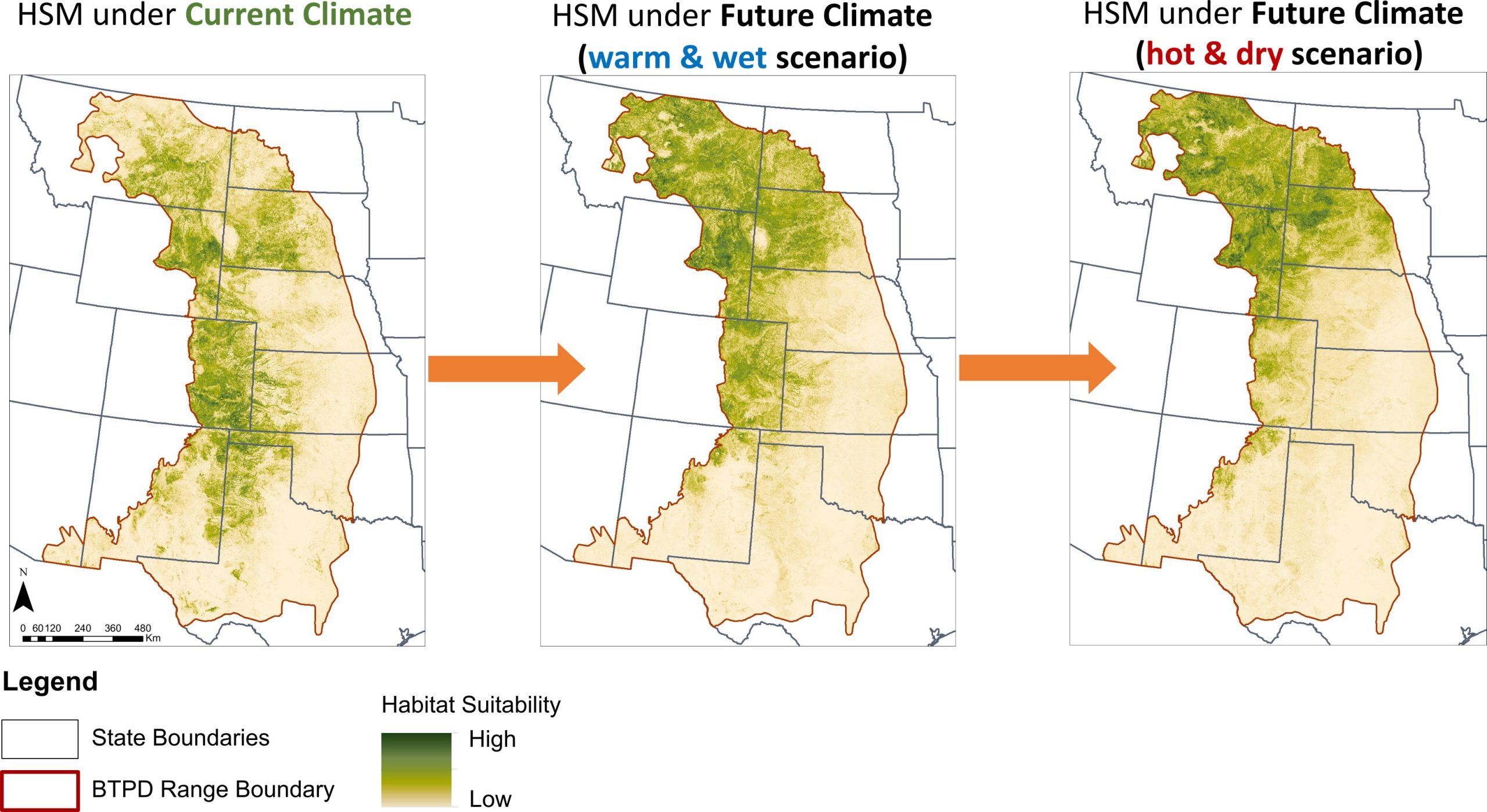 We provide a suite of HCP area scenarios to help inform different conservation and management interests, including those that consider projected climate change and jurisdictional boundaries. We created scenarios that involved current and future projected suitable BTPD habitat, across the BTPD range within the United States; these were our Range-Wide scenarios. Additionally, because conservation policies and funding decisions are often made by political entities, we also identified State-Level conservation priorities, under both present and projected future climate. Our State-Level analysis sought conservation solutions within each of the states’ boundaries only, so do not consider a rangewide perspective. This way, each state has information on conservation priorities within their own jurisdictional boundaries.