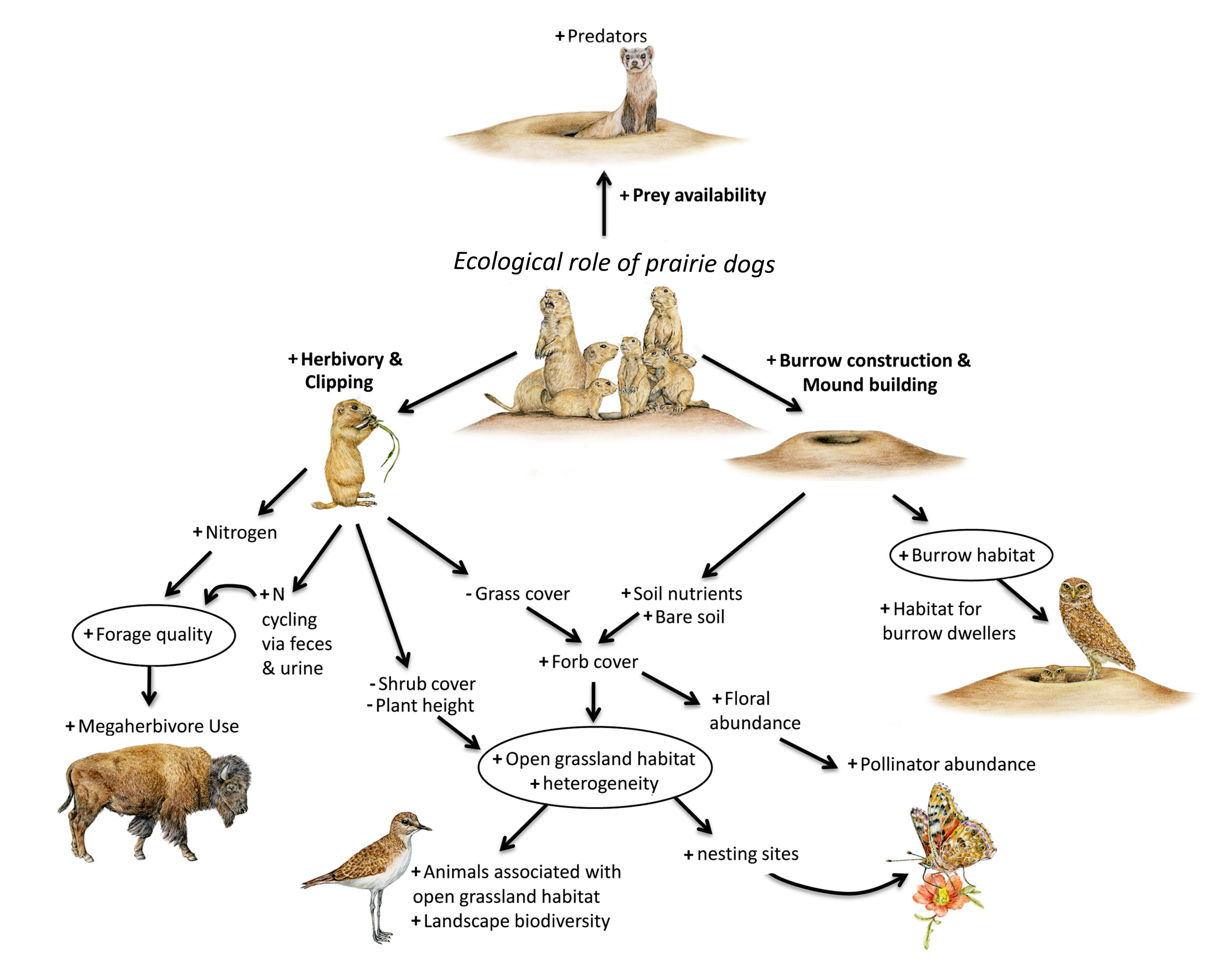 The ecological role of prairie dogs cascades throughout the prairie dog ecosystem. Plus (+) signs equal an increase in an ecosystem property as a result prairie dogs; minus (-) signs indicate a decrease. (Drawings by Sharyn Davidson; modified version from Davidson et al. 2012 Frontiers in Ecol & Environ)