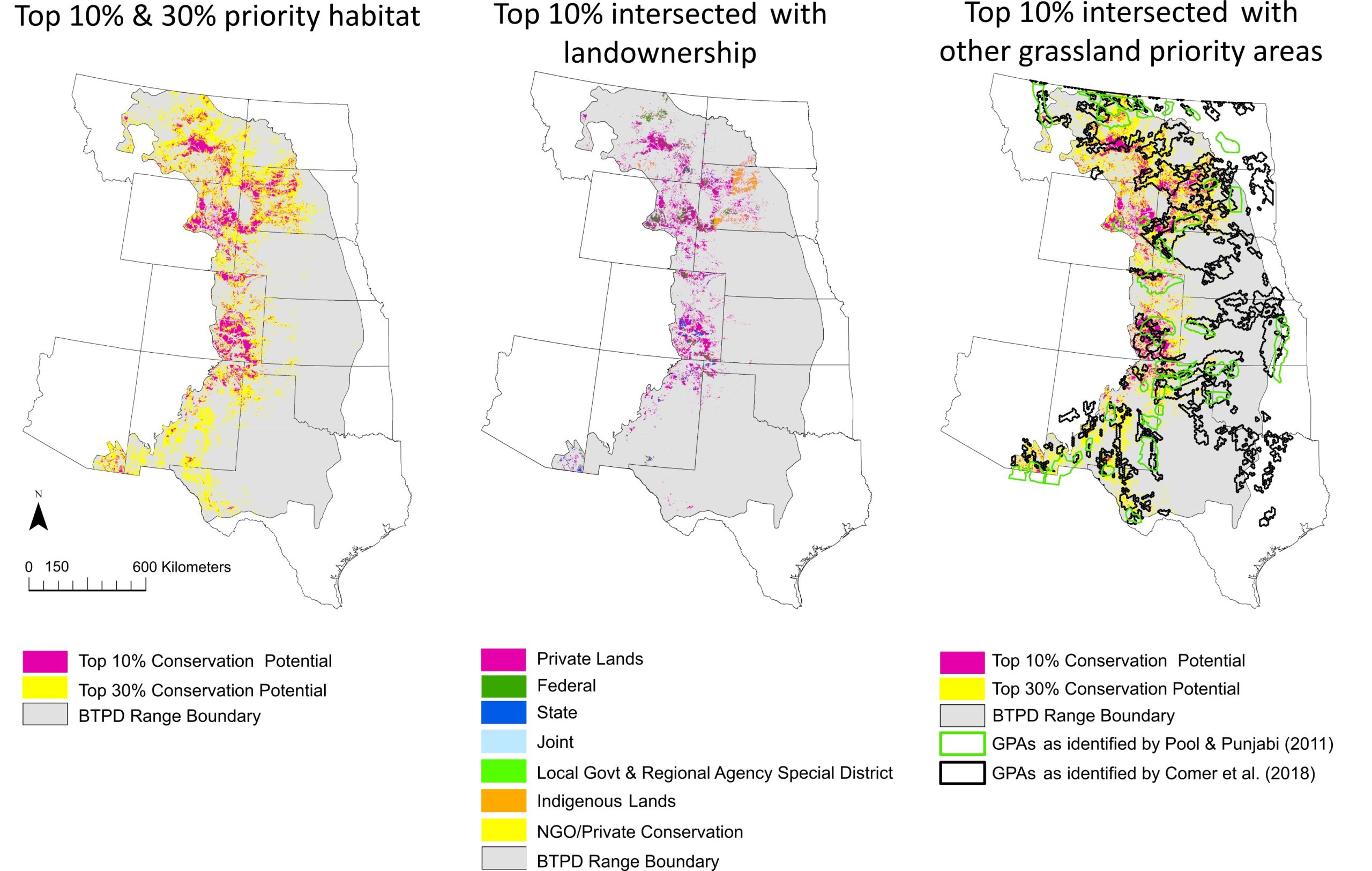 Maps of range-wide high conservation potential habitat (top 10% and 30%, across current and future climates) for the black-tailed prairie dog ecosystem (left), and the top 10% intersected with landownership (middle) and other grassland priority areas identified by Pool and Punjabi and by Comer et al. 2018 (right)