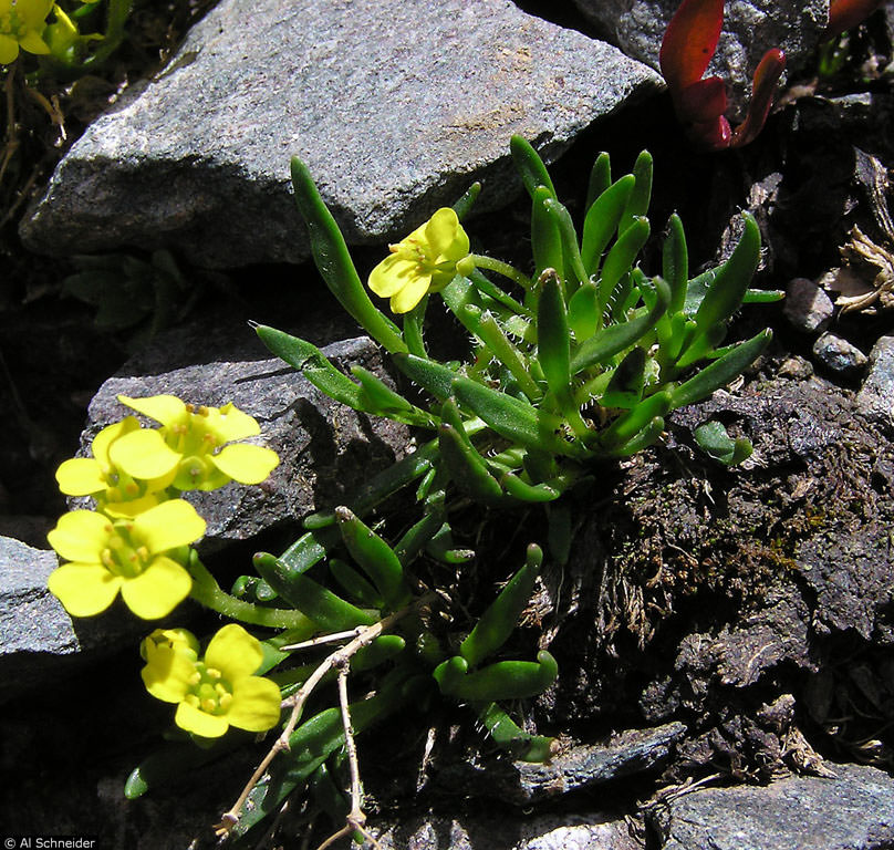 Draba graminea is a caespitose perennial herb, 1 to 5 cm tall. Stems are caulescent with slender unbranched hairs. Leaves are linear to linear-oblanceolate, glabrous except for long ciliate hairs on the lower half. These hairs are simple or sometimes forked. Cauline leaves are mostly absent; if present they number between one and six, and are reduced. The inflorescence is a raceme with three to 15 flowers subtended by leaf-like bracts. The petals are yellow and 4 to 5 mm long. The siliques are 5 to 10 mm long and 2 to 4 mm wide, elliptic-ovate, thick, and glabrous (Moore and Friedley 2004, Hitchcock 1941, Harrington 1954, Rollins 1993).Hitchcock 1941, Harrington 1954, Rollins 1993).
