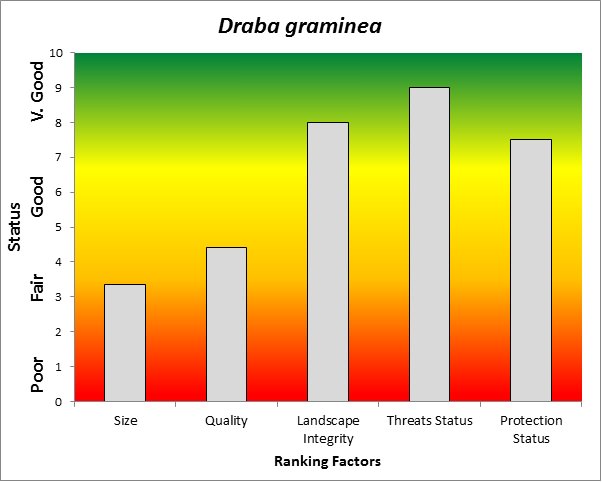![]() Summary results of an analysis of the status of Draba graminea based on several ranking factors. This species was concluded to be “Effectively Conserved”. From Rondeau et al. 2011. |
