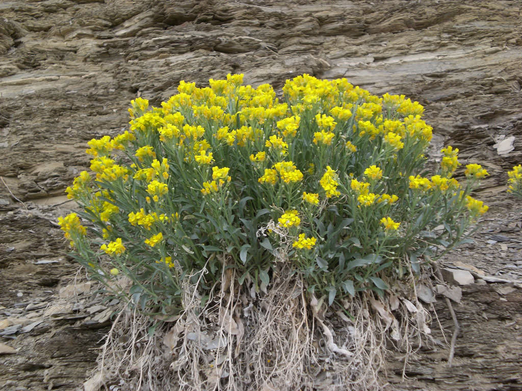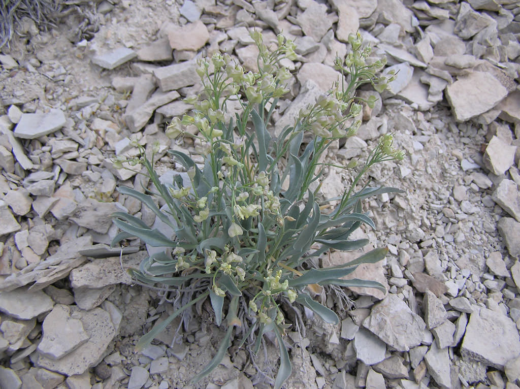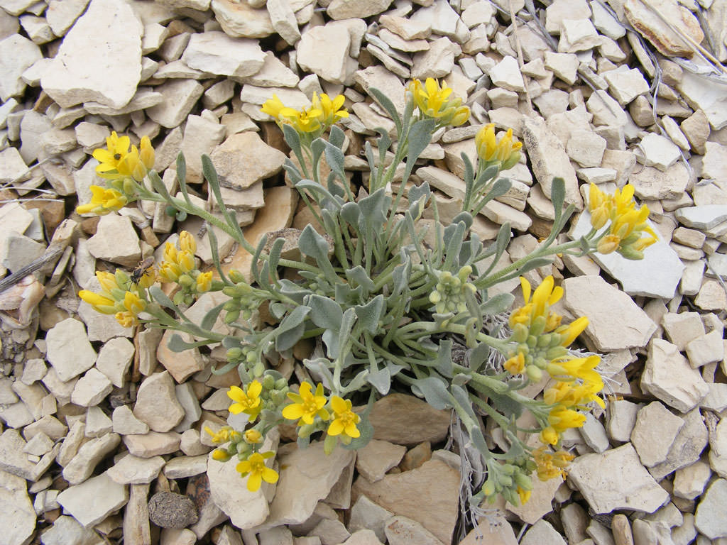 Yellow flowered perennial herb with a stout taproot, about 10-20 cm in height. Rosette leaves are oblanceolate, the margins entire to shallowly sinuate-dentate; cauline leaves are narrowly lanceolate, the margins entire. Entire plant is covered with circular trichomes resembling solder splatters. Fruit are obcordate at maturity (Spackman et al. 1997; Ackerfield 2015).