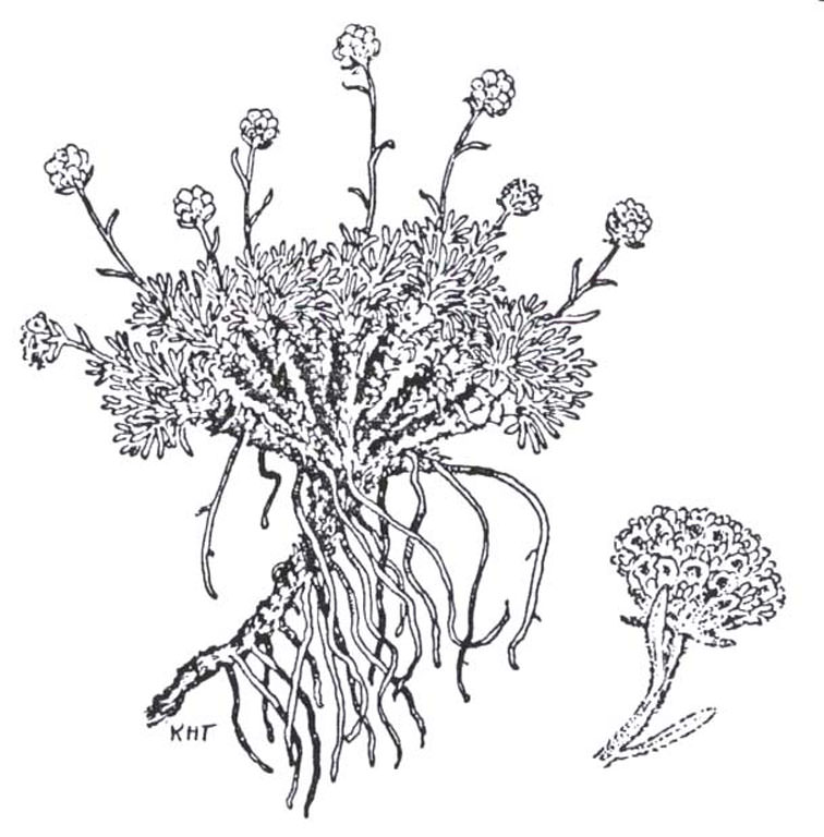 Sphaeromeria capitata is a densely caespitose, perennial herb, up to 12 cm tall, with yellow flowers. The flower heads are solitary and on the ends of subscapose branches. Leaves are mainly basal, 4-10 mm long, with narrow linear lobes. Cauline leaves are entire and reduced upward.