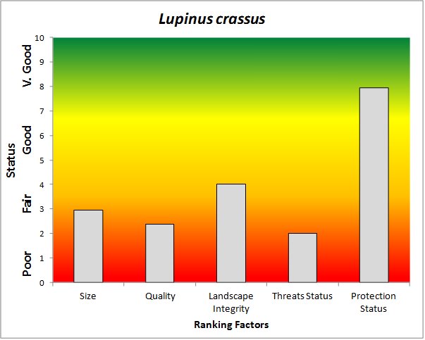 ![]() Summary results of an analysis of the status of Lupinus crassus based on several ranking factors. This species was concluded to be weakly conserved. From Rondeau et al. 2011. |