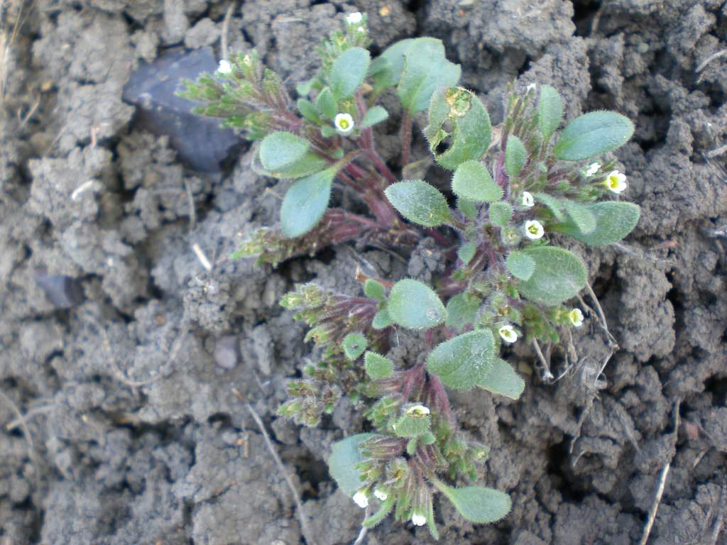 A small tap rooted, summer annual. The stems are 2 to 8 cm long often branched at the base with a deep red color, and generally lay flat on the ground in a disc-shaped clump. The reddish-colored leaves are 5 to 15 mm long egg-shaped, or almost rectangular, with rounded corners, with the bases abruptly tapering to a wedge-shaped point; the leaf margins are smooth or toothed. The stems and leaves are covered by variable numbers of straight stiff hairs. The very small tube-shaped flowers are crowded and light-yellow or cream colored often with a purple tinge. Unlike many Phacelia species the stamens do not protrude beyond the petals. The elongated-egg shaped, blackish brown seeds tend to be iridescent, and are 1.5 to 2 mm long with 6 to 12 fine ridges or corrugations (Harrington 1954).