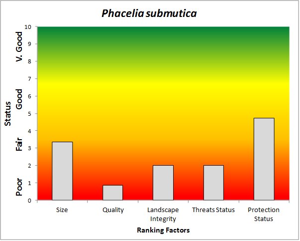 ![]() Summary results of an analysis of the status of Phacelia submutica based on several ranking factors. This species was concluded to be weakly conserved. From Rondeau et al. 2011. |