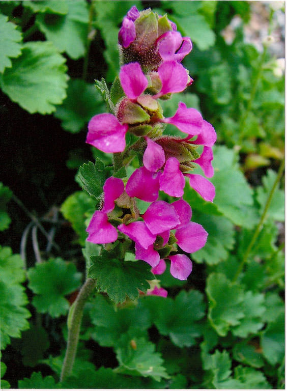 Telesonix jamesii is a perennial herb arising from a scaly, branched rhizome (Beatty, et al., 2004; Flora of North America Editorial Committee, 2009). Leaves in the basal rosette may be up to 70mm (2.75 inches) long and 55mm (2.16 inches) wide. These have long petioles and cordate bases, are kidney-shaped (reniform) or wedge-shaped (broadly cuneate), and have shallow, rounded lobes with rounded marginal teeth (doubly crenate). The alternately arranged stem leaves are similar, but smaller and have shorter petioles. The leaves and stems are glandular pubescent. The flowering stems (scapes) are up to 25.4cm (10 inches) tall (pers. obs. S. Olson), although 18cm (7.1 inches) is the tallest noted in most available manuals. The general appearance of individual flowers is round to about 1cm (0.39 in.) in diameter (Kelso, et al., 2010). Individual flowers have five petals that are 7 to 11mm (0.28 to 0.43 inch) by 4 to 7 mm (0.15 to 0.28 inch) with a narrow stalk (claw) at their base up to 3mm (0.12 inch) long. Their color is described as crimson-purple in FNA (2009), but has been called rosy to magenta pink (Kelso, et al., 2010). Flowers are arranged in paniculate cymes, appearing crowded and cylindrical. Fruit is an ovoid capsule containing 50 to 100 brown, smooth, oblong seeds (Beatty, et al., 2004).