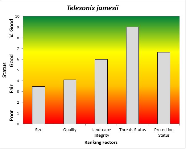 ![]() Summary results of an analysis of the status of Telesonix jamesii based on several ranking factors. This species was concluded to be Effectively Conserved. From Rondeau et al. 2011. |