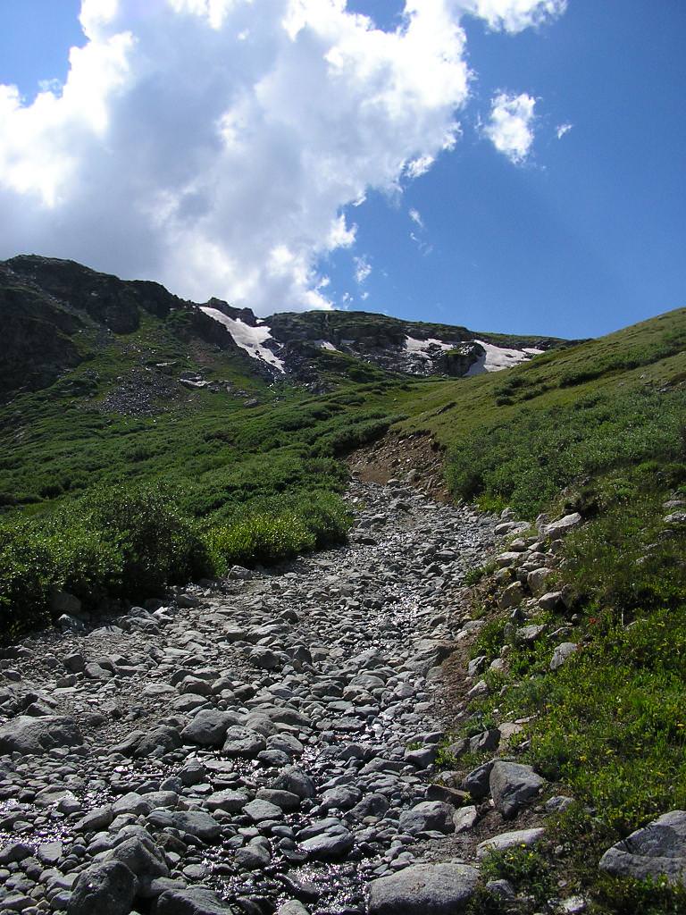 Astragalus molybdenus is one of a few alpine Astragalus species (Ladyman 2003). In Colorado, populations are found on sparsely vegetated, rocky slopes, and on turf-covered hillsides (Spackman, et al. 1997, Ladyman 2003). They occur on all aspects, with fewest facing northeast (Ladyman 2003). It is found on slopes of up to 70 percent, although most are less than 35 percent (Ladyman 2003). Populations are found on limestone or in calcareous soils (Spackman, et al., 1997, Ray 2001, Ladyman 2003). Stable habitats are preferred. Species associated with Astragalus molybdenus include Achillea millefolium, Zigadenus elegans, Astragalus alpinus, Besseya alpina, Carex rupestris, Claytonia megarhiza, Erigeron ursinus, Geum rossii, Silene acaulis, Smelowskia calycina, and Trisetum spicatum (Ray 2001, Ladyman 2003).