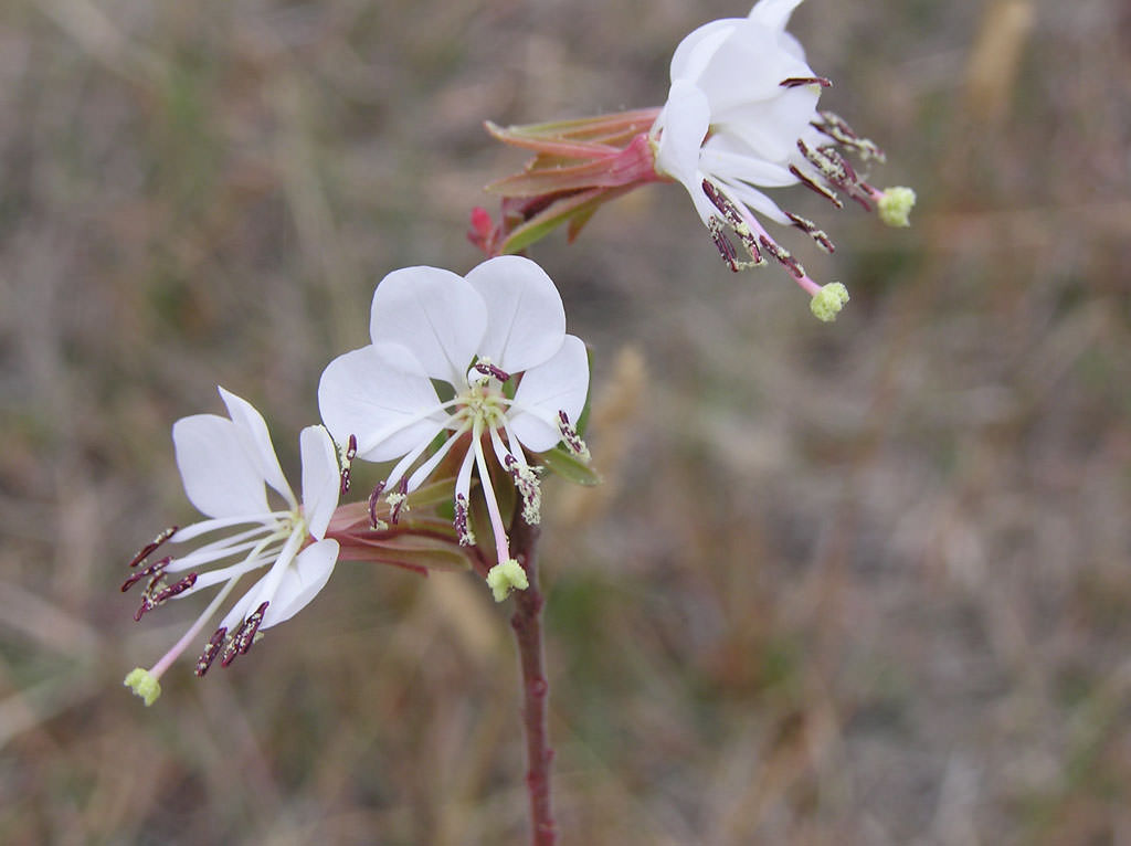 Gaura parviflora is an annual with a narrow, elongate inflorescence at all stages, and with white flowers less than 3 mm long. Gaura coccinea is a low-growing perennial with leaves less than 3 mm long, and found in drier sites.