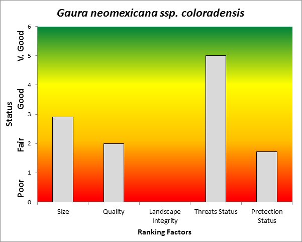 ![]() Summary results of an analysis of the status of Oenothera coloradensis based on several ranking factors. This species was concluded to be "weakly conserved. From Rondeau et al. 2011. |