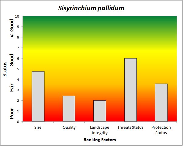 ![]() Summary results of an analysis of the status of Sisyrinchium pallidum based on several ranking factors. This species was concluded to be Moderately Conserved. From Rondeau et al. 2011. |