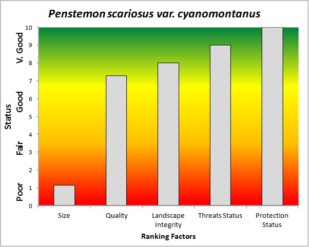 ![]() Summary results of an analysis of the status of Penstemon scariosus var. cyanomontanus based on several ranking factors. This species was concluded to be Effectively Conserved. From Rondeau et al. 2011. |