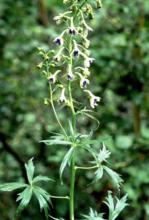 Perennial herb 1-2 m tall; stems glabrous or puberulent, sometimes reddish at the base; leaves all on stem and withered from the basal 1/5 of the stem at the time of anthesis, petioles 7-13 cm long, blades 10-20 cm long and 7-12 cm wide, palmately divided into 5 main lobes, each lobe further dissected into additional lobes or teeth that are rounded at the apex or acute with a blunt tooth (mucro); inflorescence of racemes that are paniculately branched at the base in larger specimens, 40- to 100-flowered, branches and pedicels with short hairs; sepals ovate-acute, bluish purple or pale lavender, rarely pink, sparsely pubescent, lateral sepals forward pointing, 9-14 mm long, the upper sepal extended basally into a spur 9-13 mm long; petal blades hairy, cleft, 5-7 mm long (New Mexico Rare Plant Technical Council 1999). Plants in Colorado have been observed to be 3 m or more tall (Colorado Natural Heritage Program 2012).
