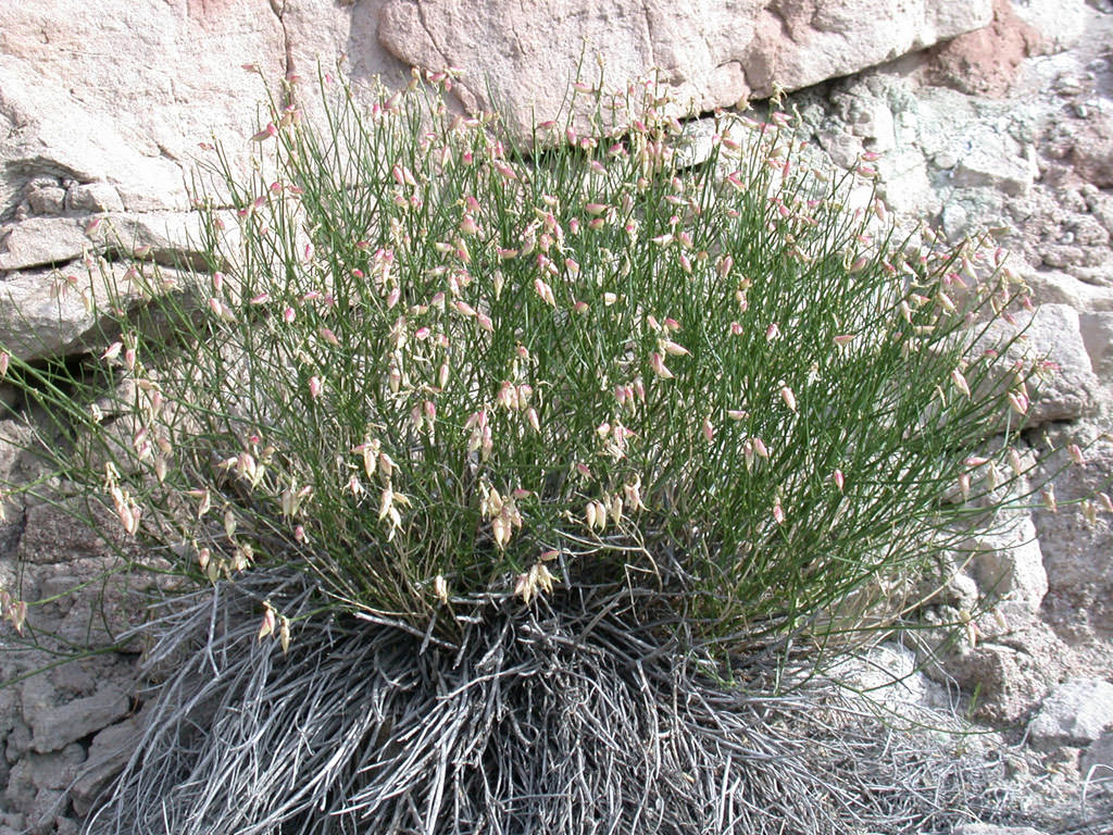 Perennials, 4-5 dm tall. Inflorescence with 6-12 flowers, usually pink-purple and white tipped, or white with purple tips. Pods sessile, mostly reflexed, although there may be some upright pods on the same plant. Pods are glabrous, ellipsoid to oblong, and laterally compressed (Ackerfield 2015, Spackman et al. 1997). Plants broomy, with many old stems forming thatch at base of plant. Leaves extremely narrow and reduced.
