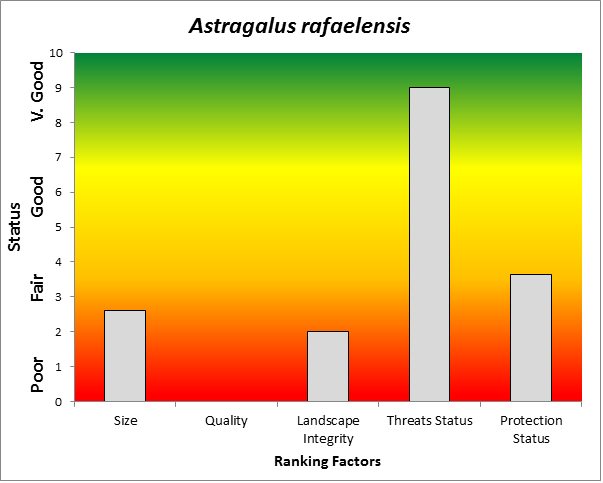 ![]() Summary results of an analysis of the status of Astragalus rafaelensis based on several ranking factors. This species was concluded to be Moderately Conserved. From Rondeau et al. 2011. |