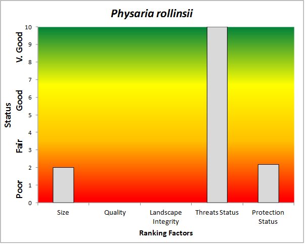 ![]() Summary results of an analysis of the status of Physaria rollinsii based on several ranking factors. This species was concluded to be “Weakly Conserved”. From Rondeau et al. 2011. |