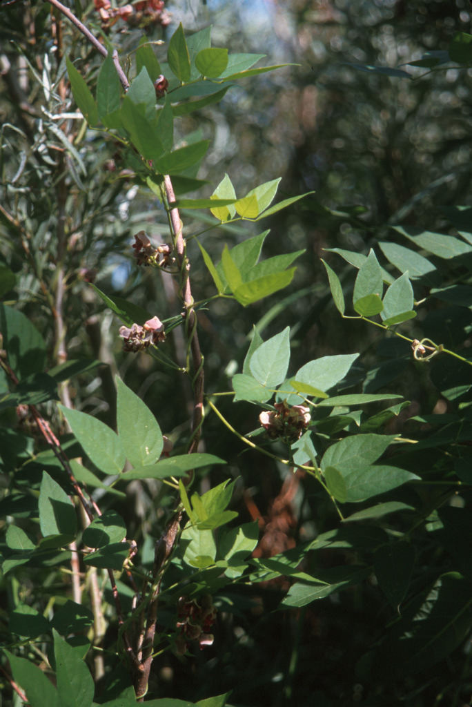 Apios americana is a perennial twining or trailing herbaceous vine, 1 to 5 meters long, with tuberous roots. Its alternate leaves have small stipules and 5 to 7 leaflets. The leaflets are ovate, acute, and 2 to 10 cm long. Plants can be glabrous to pubescent. The flowers are pedicellate and born in axillary racemes. The calyx is green or red tinted. Flowers are 8 to 10 millimeters long with five petals and a papilionaceous corolla. The banner is reflexed, whitish-pink dorsally and reddish-maroon ventrally with brown and green markings in the throat. The wings are pinkish-red and white around the distal edge. Five sepals are united, bilabiate, the upper four lobes very short or absent, the lower lobes longer. Fruits are straight or slightly curved, 5-10 mm long x 6-12 mm wide, usually with 1 seed (Anderson and Spackman 2001, Culver and Lemly 2013, Ackerfield 2015).